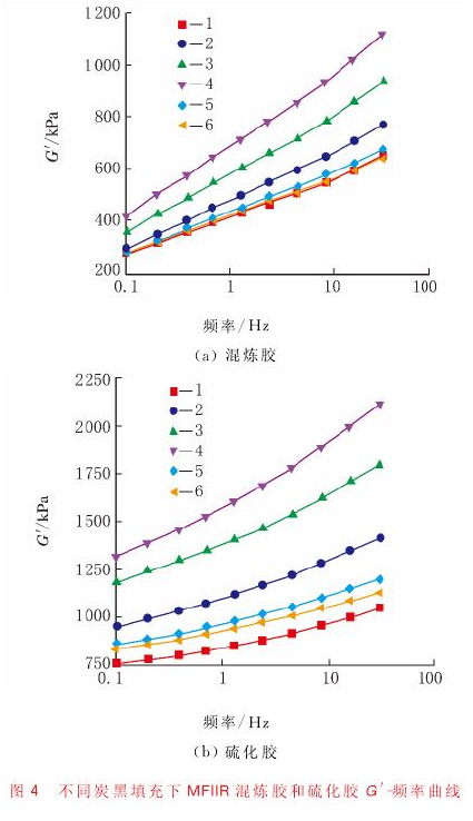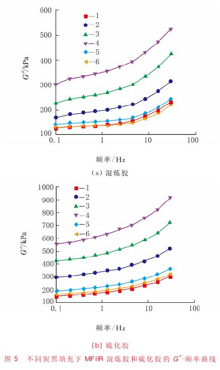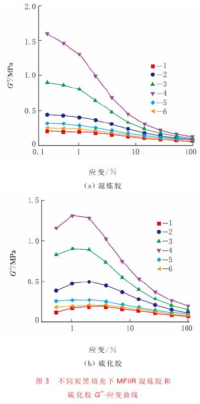 由圖3可以看出,對于MFIIR混煉膠和硫化膠,隨著炭黑用量的增加,1~4號試樣的損耗模量(G″)增加;2、5、6號試樣,隨著填充炭黑粒徑的增大,G″下降。G″反映了橡膠與橡膠、橡膠與填料以及填料與填料之間內(nèi)在的磨擦作用,在應變的作用下,體系內(nèi)部發(fā)生網(wǎng)絡的斷裂與重生,消耗一定的能量,導致G″增大。對于混煉膠1~4號試樣,隨著填充炭黑量的增加,橡膠體系內(nèi)形成的包容膠量增加,炭黑的有效填充體積增加,隨著應變作用增大,G″呈現(xiàn)下降的趨勢。而硫化膠同時由于交聯(lián)鍵作用和炭黑包容膠的作用,在較小的應變作用下只會發(fā)生膠分子鏈鍵角、鍵長的變化,并不能引起炭黑網(wǎng)絡的破壞和橡膠交聯(lián)鍵的斷裂,隨著應變增加會發(fā)生炭黑網(wǎng)絡破壞和交聯(lián)鍵的斷裂,使G″出現(xiàn)極值。對于2、5、6號試樣,填充炭黑粒徑增加,形成包容膠量少,所以G″比N330補強的硫化膠低。但同樣在應變作用下會發(fā)生對炭黑網(wǎng)絡的破壞,混煉膠G″出現(xiàn)下降的現(xiàn)象,硫化膠G″也會出現(xiàn)峰值。