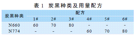 炭黑作為橡膠的主要補強劑, 其粒徑、結(jié)構(gòu)度和表面活性等對膠料的性能有重要的影響;本研究以丁腈橡膠配方為標(biāo)準(zhǔn), 采用N660、N774 兩種粒徑較大的炭黑為補強劑,對比分析了炭黑的種類及用量對NBR 皮膜膠料性能的影響。本研究采用的炭黑配方如下表1 所示。