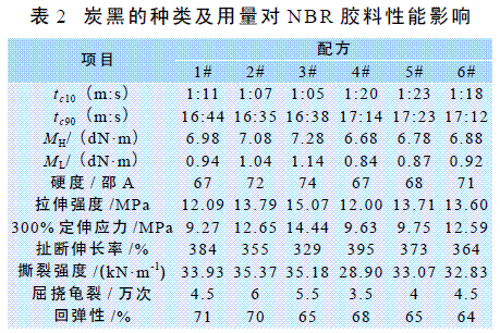 炭黑的種類及用量對NBR 膠料性能影響如下表2 所示。