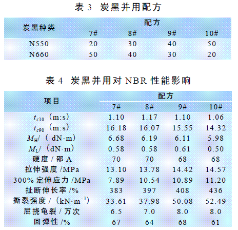 NBR 100 份(質(zhì)量份,下同),氧化鋅5 份,硬脂酸1 份,DOP 15 份,防老劑2.2 份,促進劑2 份, 硫磺0.5 份, 炭黑N660、N774、以及N660/N550 并用比均為變量。