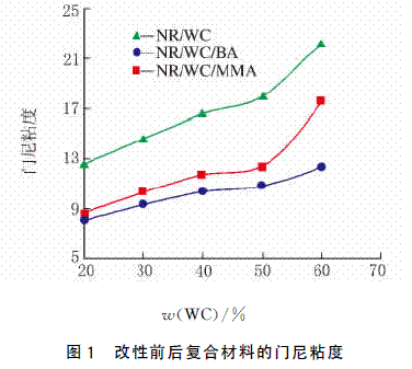 從圖1可以看出,隨著WC填充量的增加,復(fù)合材料的門尼粘度逐漸增加,膠料的流動(dòng)性逐漸降低。但通過丙烯酸酯單體接枝改性后,復(fù)合材料的流動(dòng)性有很大改善。BA比MMA對(duì)膠料的流動(dòng)性的改善更為顯著。這是因?yàn)閃C表面呈親水性,容易產(chǎn)生團(tuán)聚,在橡膠中難以分散,降低了加工流動(dòng)性。加入單體接枝改性后,單體的親水基團(tuán)與WC表面的硅醇基產(chǎn)生縮合作用,親油部分的乙烯基能與NR的雙鍵產(chǎn)生縮合,這樣接枝單體作橋梁使橡膠分子與WC結(jié)合起來,有利于在混煉過程中WC在NR中的分散,減少了團(tuán)聚作用,提高了加工流動(dòng)性。由于BA 比MMA 柔順性大,故BA對(duì)流動(dòng)性改善程度更大。