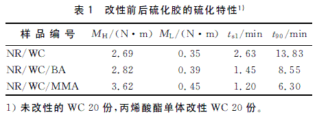 經(jīng)丙烯酸酯單體接枝改性后的NR/WC/M復(fù)合材料硫化膠的硫化特性如表1所示。