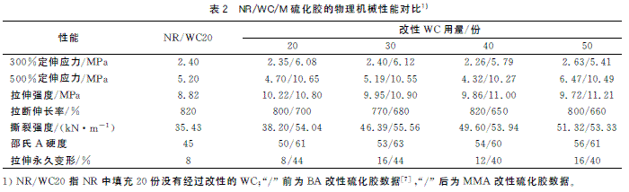 從表2可以看出,添加了丙烯酸酯單體進(jìn)行改性的NR/WC/M 復(fù)合材料的力學(xué)性能有所改善,尤其是用MMA改性過的復(fù)合材料表現(xiàn)出了更好的力學(xué)性能,其硫化膠的500%定伸應(yīng)力、拉伸強(qiáng)度以及撕裂強(qiáng)度相比未添加單體改性的體系分別提高了67%、16%和34%。MMA單體的加入在改善有機(jī)相與無機(jī)相的結(jié)合方面表現(xiàn)出來更好的“橋梁”作用,使WC在NR中的分散性更好,材料力學(xué)性能得到提高,丙烯酸酯單體適宜的填充用量為30份。