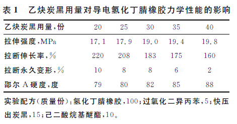 本工作測試了乙炔炭黑不同用量的導電氫化丁腈橡膠力學性能,結(jié)果見表1。