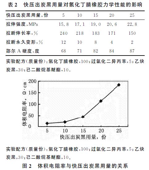 本工作測試了快壓出炭黑不同用量的導電氫化丁腈橡膠的力學性能和體積電阻率,結(jié)果見表2和圖2。