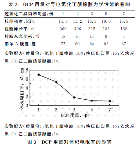 本工作測試了過氧化二異丙苯(DCP)不同用量的導電氫化丁腈橡膠的力學性能,結(jié)果見表3。
