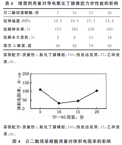 本工作測試了己二酸烷基醚酯(TP-95)不同用量的導電氫化丁腈橡膠的力學性能和體積電阻率,結(jié)果見表4和圖4。