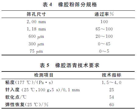(3)橡膠粉。橡膠粉顆粒規(guī)格應(yīng)符合表4~5要求。橡膠粉篩分應(yīng)采用水篩法進(jìn)行試驗(yàn)。橡膠粉密度應(yīng)為(1.15±0.05)g/cm3,應(yīng)無(wú)鐵絲或其他雜質(zhì),纖維比例應(yīng)不超過(guò)0.5%,要求含有橡膠粉重量4%的碳酸鈣,以防止膠粉顆粒相互粘結(jié)。