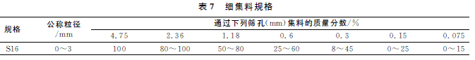 (2)細(xì)集料。采用堅(jiān)硬、潔凈、干燥、無(wú)風(fēng)化、無(wú)雜質(zhì)并有適當(dāng)級(jí)配的人工軋制的機(jī)制砂,石質(zhì)宜與粗集料相同,不用山場(chǎng)的下腳料。細(xì)集料的尺寸規(guī)格列于表7。