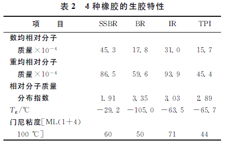 對于橡膠材料,其相對分子質(zhì)量及其分布對加工性能有很大影響。SSBR,BR,IR和TPI的生膠特性如表2所示。