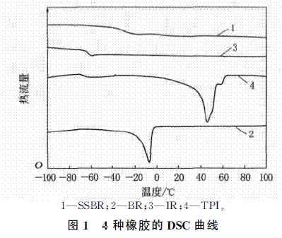 采用Stare System DSC 分析儀(瑞士Mettler-Toledo公司產(chǎn)品)對4種橡膠進(jìn)行DSC分析。測試條件為:氣氛 氮?dú)?溫度范圍 -120~+100℃;升溫速率 10℃·min-1。