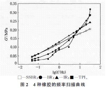 從圖2可以看出,相對于SSBR和IR,BR和TPI對頻率具有更高的敏感性。根據(jù)時間-溫度等效原理,提高溫度與降低頻率具有同等效果,因此在BR和TPI的加工過程中均需要保持一定輥溫,以降低因晶態(tài)存在而增大的儲能模量,進(jìn)而改善加工性能。