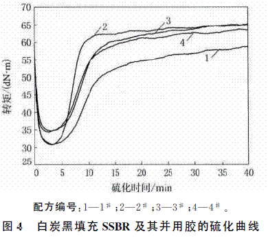 白炭黑填充SSBR及其并用膠的硫化曲線和硫化特性參數(shù)(150℃)分別如圖4和表3所示。