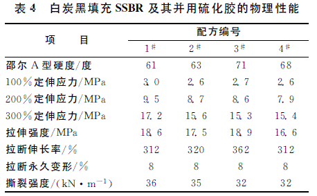 白炭黑填充SSBR及其并用硫化膠的物理性能如表4所示。
