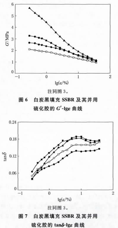 白炭黑填充SSBR及其并用硫化膠的G′-lgε曲線和tanδ-lgε曲線分別如圖6和7所示。