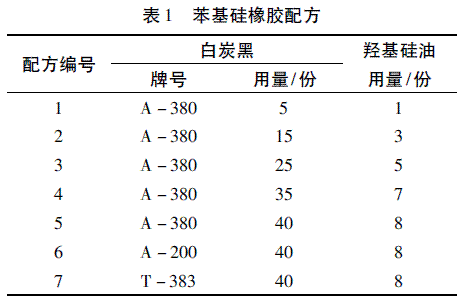 首先在廣東湛江橡塑機(jī)械廠的XK - 160 型雙輥煉膠機(jī)上放入100 份120 - 1 進(jìn)行塑煉,之后,按表1 配方加入占其總用量1 /3 的白炭黑,待吃料基本完全后,緩慢同時(shí)加入剩余2 /3 的白炭黑和相應(yīng)的羥基硅油,最后再加入0. 7 份硫化劑BIPB,混煉均勻即可。
