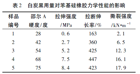2. 1 白炭黑用量對(duì)苯基硅橡膠力學(xué)性能的影響白炭黑用量對(duì)苯基硅橡膠硫化膠力學(xué)性能的影響見表2。