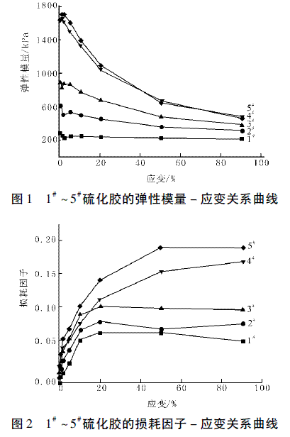 從圖2 可以看出,相同應(yīng)變下,隨著白炭黑用量的增大,苯基硅橡膠的損耗因子依次遞增; 隨應(yīng)變的增加,苯基硅橡膠的損耗因子呈上升趨勢(shì)。羥基硅油與白炭黑的質(zhì)量比是1∶ 5。當(dāng)苯基硅橡膠中白炭黑的用量達(dá)到一定程度時(shí)便會(huì)形成附聚體網(wǎng)絡(luò),這種附聚體網(wǎng)絡(luò)密度很大,需要吸入很多能量方能打破[4 - 5]; 同時(shí)苯基硅橡膠大分子與白炭黑形成了凝膠網(wǎng)絡(luò),也需要吸收能量方能打破。1# ~ 3#樣品中白炭黑加入量不足以形成附聚體網(wǎng)絡(luò)和凝膠網(wǎng)絡(luò),所以彈性模量隨應(yīng)變的增大變化不明顯; 而4# 和5# 樣品中白炭黑的加入量較多,形成了附聚體網(wǎng)絡(luò)和凝膠網(wǎng)絡(luò),施加應(yīng)變破壞了網(wǎng)絡(luò)結(jié)構(gòu),所以彈性模量隨應(yīng)變?cè)龃蠖杆傧陆?。兩種網(wǎng)絡(luò)結(jié)構(gòu)被破壞時(shí)會(huì)消耗能量導(dǎo)致?lián)p耗因子增加; 另外形變過程中分子鏈沿剪切方向運(yùn)動(dòng),大體積的苯基有更高的位阻,分子間的摩擦也隨之增加[6],這些均會(huì)導(dǎo)致?lián)p耗因子增大。