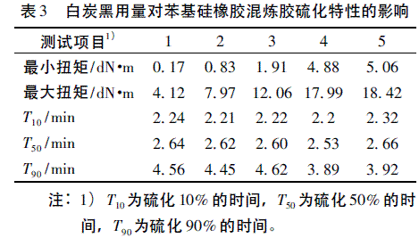 表3 是白炭黑用量對(duì)苯基硅橡膠混煉膠硫化特性的影響。