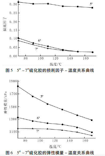 在不同應(yīng)變下,隨著應(yīng)變的增加,苯基硅橡膠硫化膠的彈性模量逐漸減小,損耗因子逐漸增大; 在相同應(yīng)變下,隨著白炭黑用量的增多,苯基硅橡膠硫化膠的彈性模量和損耗因子增大。在不同溫度下,白炭黑用量不同的苯基硅橡膠硫化膠的彈性模量和損耗因子在70 ~ 170℃范圍內(nèi)變化不明顯; 隨著白炭黑粒徑的減少,苯基硅橡膠的彈性模量和損耗因子增大,細(xì)粒徑白炭黑的補(bǔ)強(qiáng)效果比粗粒徑白炭黑好。