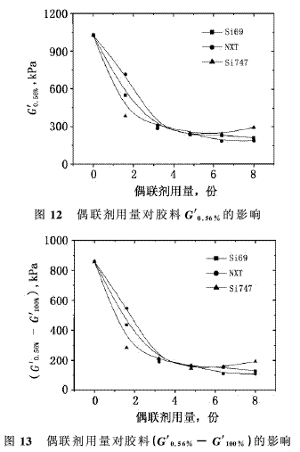 3)Si69改性體系膠料和硫化膠的G′0.56%和G′0.56%-G′100%,隨Si69用量增加明顯降低,當(dāng)Si69用量達(dá)到3.2份后,變化不大;NXT和Si747改性體系膠料和硫化膠的G′0.56%和G′0.56%-G′100%均隨偶聯(lián)劑用量的增加明顯降低,膠料和硫化膠的G′0.56%和G′0.56%-G′100%,當(dāng)NXT和Si747用量分別達(dá)到3.2份和6.4份后,變化不大,同時(shí)偶聯(lián)劑用量達(dá)到4.8份后,NXT和Si747改性體系硫化膠的Payne效應(yīng)明顯較Si69改性體系小。