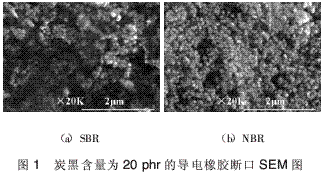 圖1為20 phr炭黑含量的兩種導(dǎo)電橡膠斷口的SEM圖。