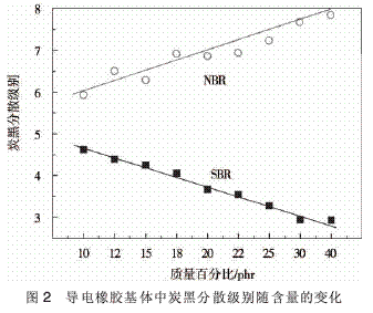 丁苯橡膠的炭黑填充系數(shù)比較大,炭黑10 phr時的分散級別(衡量炭黑顆粒在橡膠基體中分散的均勻程度,級別越高分散越好。)為4.62,到40 phr時降為2.93,如圖2所示。分散級別隨炭黑填充含量的增加不斷減小,表明炭黑與丁苯橡膠基體的相溶性不好,分散性能不理想。隨著炭黑含量增加團聚增多,分散越來越困難。而炭黑在丁腈橡膠基體中的分散性能與在丁苯橡膠中相反,分散級別隨著含量的增加而增大,從10 phr時的2.84增大到40 phr時的7.84,表明炭黑與丁腈橡膠基體的相溶性很好。丁腈橡膠為極性橡膠,基體的極性碳鏈與炭黑表面極性分子基團相互吸引從而增加基體與炭黑的親和性,炭黑顆粒被吸附在基體極性分子鏈中。隨炭黑含量增加,在混煉過程中炭黑的二次結(jié)構(gòu)粒子受到的剪切作用不斷增大,受剪切破壞的概率也增大,引起炭黑的二次結(jié)構(gòu)破裂,所以分散更均勻。