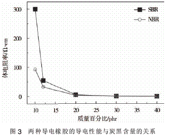 (1)導(dǎo)電橡膠的體電阻率除了與炭黑含量關(guān)系比較密切,橡膠基體的性質(zhì)也會對導(dǎo)電性能產(chǎn)生影響。