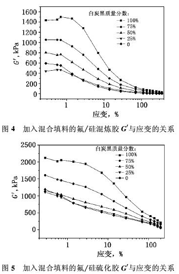 2.6 RPA分析 加入混合填料的氟/硅混煉膠和硫化膠的剪切模量(G′)與應(yīng)變的關(guān)系分別如圖4和圖5所示。
