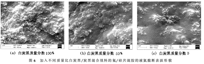添加不同質(zhì)量比的白炭黑/炭黑混合填料的氟/硅共混膠的液氮脆斷表面形貌如圖6所示。