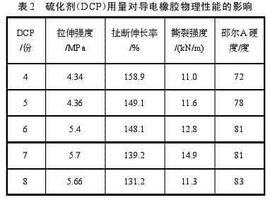 導(dǎo)電炭黑用量固定為20份,硫化劑(DCP)用量對(duì)導(dǎo)電橡膠物理性能的影響如表2所示。