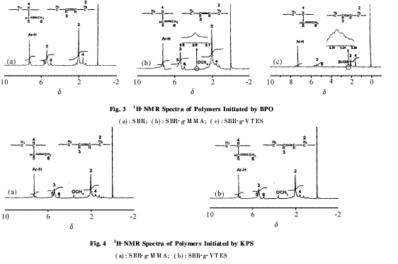 2.2 接枝丁苯橡膠的1H-NMR  文獻報道[6],丁苯橡膠分子鏈上的雙鍵和烯丙基氫都可作為接枝反應(yīng)的引發(fā)點。由Fig.3(a)可知,δ=4·9~5·4為烯烴氫(=CH和=CH2)的特征峰,δ=1·5~2·1為兩種烯丙基氫(-CH和-CH2)的特征峰[6]。Fig.3(b)中新出現(xiàn)的δ=3·5~3·7處是烷氧基(-OCH3)的特征峰,是MMA接枝的結(jié)果,Fig.3(c)中新出現(xiàn)的δ=2·2~2·3處是硅羥基氫(Si-OH)的特征峰,是VTES接枝的結(jié)果。Fig.4中可得到相同的結(jié)論。同時從Fig.3中可知,橡膠分子鏈中所有烯丙基氫的峰面積為(a) 58.86%, (b) 53.13%, (c)56.63%,烯烴氫峰面積為(a)27.25%,(b)26.04%,(c)24.10%,這說明BPO引發(fā)了包括雙鍵和烯丙基氫的接枝反應(yīng)。而從Fig.4可知,接枝橡膠分子鏈結(jié)構(gòu)中的烯丙基氫峰面積為(a)58.54%,(b)58.23%,烯烴氫峰面積為(a)24.13%,(b)25.39%,而沒有接枝的SBR中烯丙基氫和烯烴氫峰面積分別為58.86%和27.25%,這說明KPS引發(fā)接枝聚合主要按雙鍵加成機理進行。