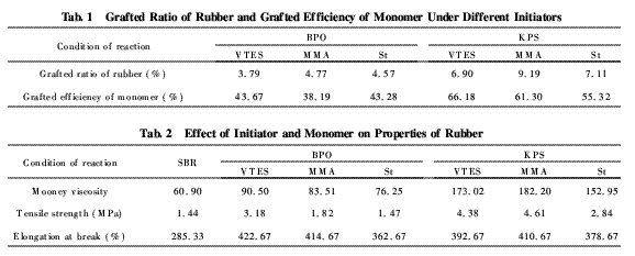 在500 mL四口燒瓶中加入SBR膠乳300 g,在氮氣保護、攪拌的條件下將11 g接枝單體和0·15 g引發(fā)劑慢慢加入到膠乳中(KPS用1g水溶解后加入),約30 min滴加完畢,繼續(xù)攪拌乳化約30 min。然后升溫至80℃。在氮氣保護下恒溫反應(yīng)6 h,得到改性的乳液。最后凝聚、烘干得到改性SBR。