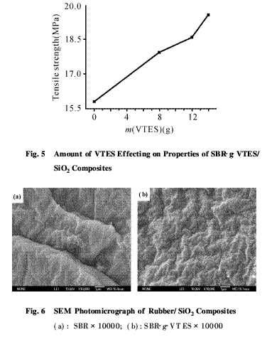 Fig.5是不同質(zhì)量VTES接枝的SBR對SBR-g-VTES/SiO2復(fù)合材料拉伸強度的影響。從圖中可知,其拉伸強度隨VTES加入量的增加而增加,當(dāng)VTES加入量為14 g時,其拉伸強度增加了23.72%。這是因為SBR接枝VTES后,可在SBR和SiO2之間形成“橋梁”,增強兩者的相互作用,受到外力作用時SiO2不易與基體脫離,從而吸收大量能量使基體較好地傳遞外應(yīng)力。Fig.6是SBR-g-VTES/SiO2復(fù)合材料斷面的SEM圖,圖中小白點是SiO2。從圖中可知,(b)中SiO2分布更加均勻,復(fù)合體系的斷面為不規(guī)則的凸凹不平斷裂痕跡,在基體受到拉伸時可消耗更多的能量,提高復(fù)合材料拉伸強度。