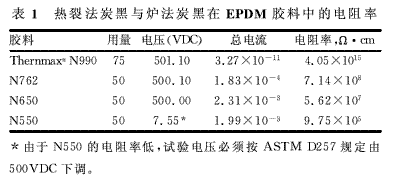 雖然其微觀結(jié)構與石墨類似,但炭黑當中碳層的排列卻較為無序。這就使得炭黑成為一種固有的半導電材料,盡管賦予橡膠膠料導電性的多少還取決于其他因素。原生粒子尺寸、結(jié)構、孔隙率、表面氧化基團和填充量等,所有這些因素在膠料導電性中都發(fā)揮著作用。根據(jù)文獻的報道,原生粒子尺寸是影響炭黑導電性的主要參數(shù)。聚集體內(nèi)炭黑粒子間縫隙的平均寬度,也被認為是影響導電性的因素之一。表1報告了三種爐法炭黑與N990在三元乙丙橡膠(EPDM)試驗膠料中的體積電阻率(Ω·cm)。ASTM D991《導電和抗靜電產(chǎn)品的體積電阻率》是測試橡膠性能的標準的方法。不過,在本實驗中并不能遵循ASTMD991標準,因為這種含N990炭黑的膠料的電阻率太高。為此,按ASTM D257《絕緣材料的直流電阻或電導》來評估體積電阻率。含爐法炭黑的膠料可按ASTM D991標準測定,但為了保持一致也通過ASTM D257標準來評估。
