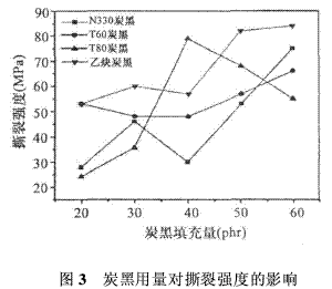 圖3為炭黑用量對(duì)撕裂強(qiáng)度的影響,由圖3可知,隨著N330、T60、乙炔導(dǎo)電炭黑用量的增加,橡膠的撕裂強(qiáng)度先減小后增大,乙炔炭黑填充60份時(shí)撕裂強(qiáng)度為83 MPa, N330炭黑填充60份時(shí),橡膠撕裂強(qiáng)度為76MPa,乙炔炭黑填充橡膠的撕裂強(qiáng)度高于N330炭黑填充橡膠, T60炭黑填充橡膠的撕裂強(qiáng)度變化趨勢(shì)較平緩填充40份時(shí)最低為48MPa,填充60份時(shí)最高為66 MPa;隨T80炭黑填充量的增加,橡膠的撕裂強(qiáng)度先增加后降低,填充40份時(shí)最大為79 MPa。