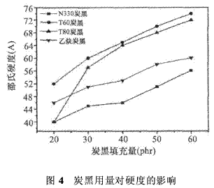 圖4為炭黑用量對(duì)硬度的影響,由圖4可知,隨著4種炭黑的用量增加,橡膠的硬度增加,其中T60、T80填充橡膠硬度變化趨勢(shì)相近且明顯高于乙炔炭黑、N330炭黑填充橡膠,N330炭黑填充橡膠的硬度最小,主要是因?yàn)镹330炭黑比密度大,填充相同量的炭黑對(duì)橡膠硬度的影響小。
