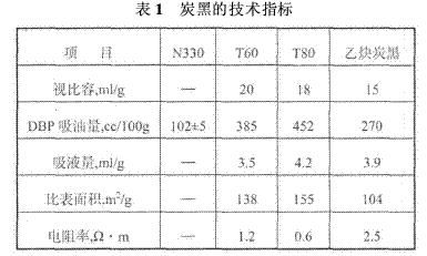 炭黑的結(jié)構(gòu)性是其獨(dú)特而又非常重要的一種性質(zhì),它是表示非常細(xì)的炭黑粒子間聚集成鏈狀或葡萄狀的程度。結(jié)構(gòu)性越高,鏈狀(或葡萄狀)結(jié)構(gòu)越發(fā)達(dá),越容易形成炭黑空間網(wǎng)絡(luò)通道結(jié)構(gòu),這種結(jié)構(gòu)是分散時(shí)可保持的最小基本單元,不容易被破壞,炭黑在高聚物中是以聚集體為基本單位存在的在生產(chǎn)加工過程中粒子聚集體和聚合物永久性地熔合在一起,除非過強(qiáng)的剪切作用。從宏觀上,常用吸油值(DBP)來表示結(jié)構(gòu)性,DBP值越大,結(jié)構(gòu)性越高。導(dǎo)電炭黑的物理性能和導(dǎo)電性取決于這些聚集體的體積和微孔程度。導(dǎo)電炭黑DBP吸油量越大越容易形成顆粒數(shù)量較多結(jié)構(gòu)復(fù)雜的聚集體,其單位質(zhì)量的聚集體就越多。故在一定條件下,炭黑的DBP吸油量越大,其導(dǎo)電性越強(qiáng)。以組成炭黑基本聚集體和形態(tài)的粒子為基準(zhǔn),高結(jié)構(gòu)的炭黑聚集體具有大而高分支群的粒子,這種分支增加了聚集體間的接觸,可導(dǎo)致高導(dǎo)電性能;同時(shí),導(dǎo)電炭黑表面積越大,其單位質(zhì)量的聚集體就越多。也就是結(jié)構(gòu)越高,比表面積越大,導(dǎo)電性越強(qiáng)。表1為炭黑的技術(shù)指標(biāo)。