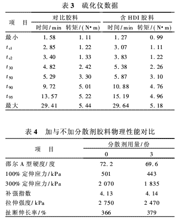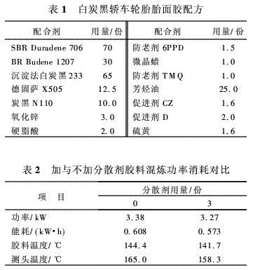 一種有效的分散劑將減少混煉過(guò)程中的能量消耗并能夠使填料快速地混入。功率消耗測(cè)量結(jié)果(見(jiàn)表2)表明,添加分散劑可以降低功率消耗和膠料溫度。