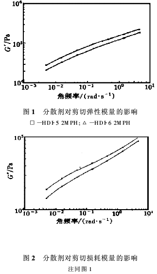 加與未加分散劑膠料的彈性模量測(cè)量結(jié)果表明,加入分散劑膠料的彈性模量較低(見(jiàn)圖1)。彈性模量低表明填料與填料間的相互作用較弱,也就是說(shuō)填料粒子得到了較好的分散。彈性模量低也可以反映出膠料比較容易加工以及改善了擠出型膠的尺寸穩(wěn)定性。