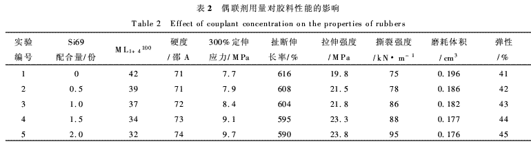 (2)加入偶聯(lián)劑Si69后,膠料的加工性能及物性顯著提高,偶聯(lián)劑Si69在膠料中的最佳用量1~2·5份左右為宜。