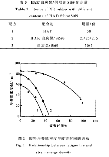 分別采用HAF、HAF/白炭黑/Si69、白炭黑/Si69 3種補(bǔ)強(qiáng)體系補(bǔ)強(qiáng)膠料,測定膠料在疲勞過程中形變能密度的變化。HAF/白炭黑/偶聯(lián)劑Si69配合量見表3。拉伸比λ=1·50,疲勞機(jī)轉(zhuǎn)速為500r·min-1時,對3種補(bǔ)強(qiáng)的硫化膠試樣經(jīng)疲勞試驗一定時間后,分別對其進(jìn)行拉伸,通過應(yīng)力-應(yīng)變曲線下的面積積分得到形變能密度,形變能密度與疲勞時間之間的關(guān)系見圖1。