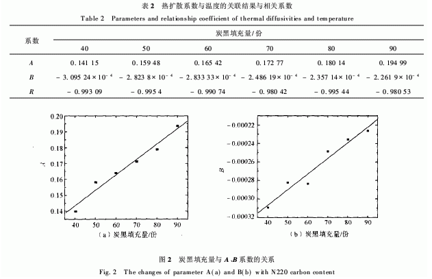 (1)混煉膠的熱擴(kuò)散系數(shù)隨炭黑用量的增加而增大,說明了添加炭黑多的膠料其熱量傳遞的快,溫度敏感性強(qiáng)。