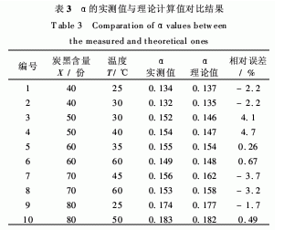 將表2中的A、B與炭黑填充量的關(guān)系數(shù)據(jù)用最小二乘法進(jìn)行回歸分析,得出2個(gè)方程式:A=0·106 12+9·672 29×10-4X (2)B=-3·741 22×10-4+1·689 67×10-6X(3)將式(2)、式(3)帶入式(1)中,即得熱擴(kuò)散系數(shù)α與溫度T和炭黑N220填充量X的關(guān)聯(lián)式:α=0·106 12+9·672 29×10-4X+(-3·741 22×10-4+1·689 67×10-6X)T(4)在測試溫度和炭黑填充量的范圍內(nèi)隨意抽取10組數(shù)據(jù),與采用公式(4)計(jì)算的理論值相比較,結(jié)果見表3。