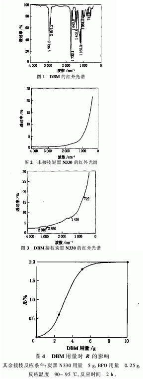 在裝有攪拌器的三口燒瓶中先加入表面羥基化的炭黑N330,再倒入溶入BPO的DBM,通氮氣保護(hù),在常溫下攪拌10 min,把三口燒瓶置于甘油浴中恒溫加熱至90~95℃,反應(yīng)至規(guī)定時間。反應(yīng)結(jié)束后,反應(yīng)產(chǎn)物經(jīng)大量丙酮洗滌、抽濾,置于50℃下干燥至質(zhì)量恒定。