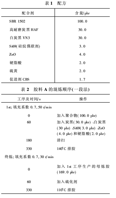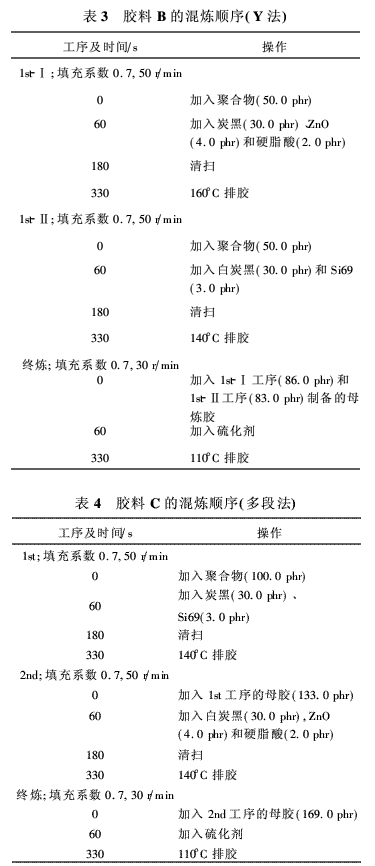 表1為該研究所用膠料的配方?;鞜挷捎肗aniwa機(jī)械公司生產(chǎn)的NM-1.5-20型捏合機(jī),混煉工藝條件列于表2~表4。膠料A(表2)采用一段法,就是除硫化劑以外的所有配合劑都在單一工序中混煉。該工藝常用于普通炭黑填充膠料,生產(chǎn)效率最高。Y法順序用于膠料B(表3),其中炭黑母和白炭黑母膠分別制備(1st-Ⅰ工序和1st-Ⅱ工序),隨后一同在最終工序中混煉。膠料C(表4)則采用多段法混煉。白炭黑和硅烷偶聯(lián)劑均在頭道工序中被加入母膠,其它配合劑(除硫化劑以外)則在第二道工序中與該母膠一起混煉。該工藝一般用于白炭黑填充膠料的混煉。所有混煉順序的填充系數(shù)均為0.7。所有混煉工序的溫度均為140°C。但Y法混煉順序中1st-Ⅰ工序的溫度為160°C,這是因?yàn)闆](méi)有硅烷偶聯(lián)劑的緣故,若有的話(huà)其與聚合物的反應(yīng)溫度可能高于140°C。所有混煉順序中的膠料(加入硫化劑)均在110°C下混煉。在所有混煉順序中母煉膠和膠料采用的轉(zhuǎn)子速率分別為50 r/min和30 r/min。