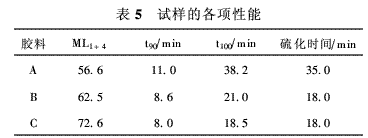 分別用一段法順序(A)、Y法順序(B)和多段法順序(C)制備了3種不同的膠料。ML1+4、t90、t100和硫化時(shí)間的數(shù)值列于表5,該表提供了有關(guān)這些膠料是否適合于生產(chǎn)的重要信息。ML1+4是衡量膠料加工性能的一個(gè)指標(biāo);加工性能隨著ML1+4值的減小而提高。