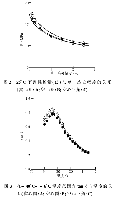 門(mén)尼粘度值(ML1+4)用Shimadzu SMV-201型門(mén)尼粘度計(jì)在130°C下測(cè)定。硫化曲線(xiàn),即橡膠應(yīng)力隨硫化時(shí)間的變化用硫化儀(Nichigoushoji V型)在170°C下測(cè)得。90%和100%硫化所需要的時(shí)間(t90和t100)分別根據(jù)對(duì)應(yīng)于0%和100%硫化的最小和最大的扭矩計(jì)算。每種試樣的硫化時(shí)間在t90和t100之間。粘彈性可用UeshimaVR-7110型粘彈性分析儀,按照標(biāo)準(zhǔn)JIS K6394測(cè)定。25°C下彈性模量(E′)與應(yīng)變的關(guān)系在10 Hz頻率時(shí)測(cè)定。高溫(>40°C)和低溫(< 0°C)下tanδ與溫度的關(guān)系分別用單一應(yīng)變幅度1.00%和0.25%在頻率為10 Hz時(shí)測(cè)得。100%、200%和300%定伸應(yīng)力(分別為σ100、σ200和σ300)、拉斷強(qiáng)度(σbreak)和拉斷伸長(zhǎng)率(εbreak)可在Shimadzu AGS-500拉伸試驗(yàn)機(jī)上以啞鈴狀試樣,按照標(biāo)準(zhǔn)JIS K6251,在伸長(zhǎng)率500 mm/min條件下測(cè)定。邵爾A型硬度用Excel RH-101A自動(dòng)邵爾硬度計(jì),按照標(biāo)準(zhǔn)JIS K6253測(cè)定之。