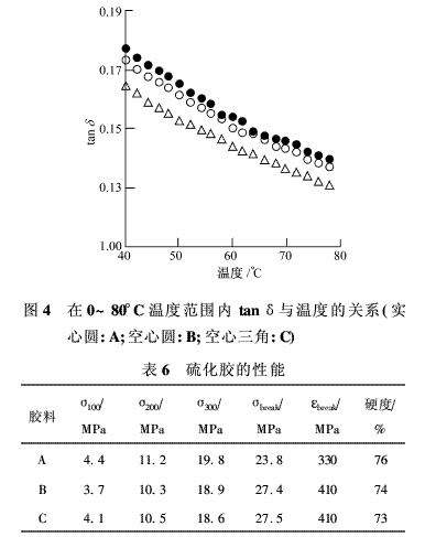表6為拉伸和硬度試驗(yàn)的結(jié)果。膠料B和C的σ100、σ200、σ300和硬度都低于膠料A,這有利于防止使用中由應(yīng)力集中引起的裂口增長(zhǎng)等問(wèn)題。這些數(shù)據(jù)表明,與膠料A相比,對(duì)于膠料B和C來(lái)說(shuō),硅烷偶聯(lián)劑和白炭黑之間較為有效的反應(yīng)使分散得到了改善。膠料B和C的σbreak和εbreak均高于膠料A,這表明膠料B和C在使用中抗撕裂、抗磨耗和抗裂口增長(zhǎng)性能都得到了提高。總的來(lái)說(shuō),在這些方面,膠料B和C之間并無(wú)大的差異。試驗(yàn)結(jié)果清楚地表明,Y法混煉產(chǎn)生的結(jié)果類(lèi)似于多段法混煉,優(yōu)于一段法混煉。