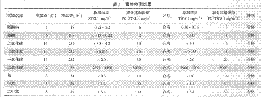該建設項目主要存在的職業(yè)病危害因素有碳酸鈉、硫酸、二氧化硫、二氧化氮、一氧化碳、二氧化碳、苯、甲苯、二甲苯、白炭黑塵、石英砂、硅酸鈉、煤渣塵、煤焦油等。由于煤焦油、硅酸鈉國家目前尚未制訂職業(yè)接觸限值,以及本次該建設項目職業(yè)病危害控制效果評價現(xiàn)場檢測時間在3月,不符合高溫檢測規(guī)范要求的高溫檢測季節(jié),因此本次職業(yè)病危害控制效果評價不將煤焦油、硅酸鈉、高溫列入檢測項目。